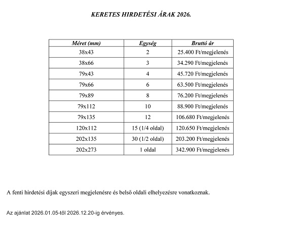 | 2026. január 5-től érvényes apróhirdetési árak: | |